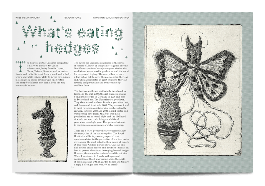 A small and beautiful magazine from Amsterdam, Pleasant Place considers the art of gardening. This sixth issue is themed ‘Topiary’, and it digs into the history of cutting trees and hedges into strange shapes, as well as the most recent developments in this human compulsion, “To force the unruly natural world into submission, as if we were tiny gods on earth.”
