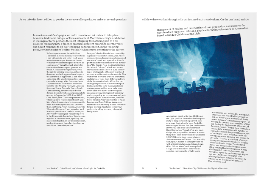 A contemporary music magazine based in Lucerne, Zweikommasieben is as experimental and exciting as the artists it reports on. Each issue takes a completely different format, and for the 27th instalment, they play around with elongating their texts, taking the reader on a strange and disorienting journey through this moment in music.