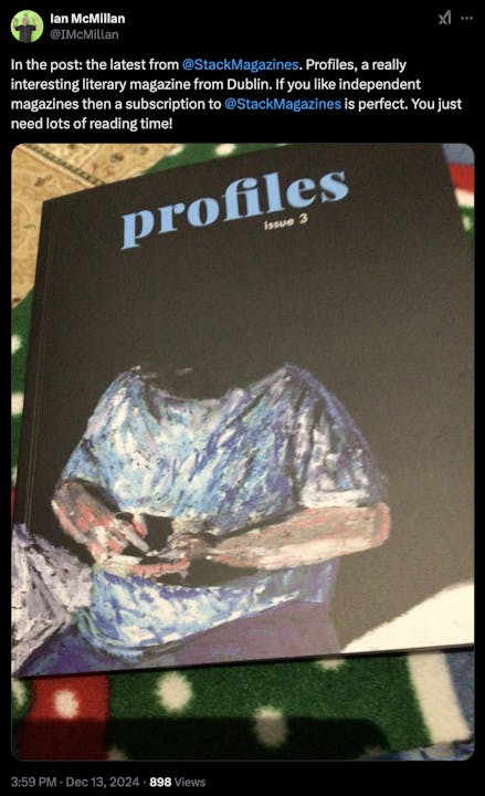 Ireland has an extraordinarily vibrant magazine scene and we’re very happy to have found a strong readership at home, although we’ve found smaller audiences in the UK, North America and mainland Europe too. We sell Profiles at bookshops and art galleries, suggesting our audience is made up of literature and art lovers alike, which is exactly what we wanted.