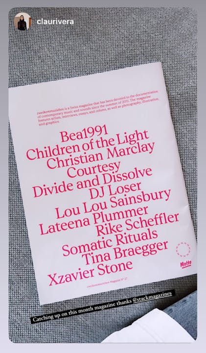 Zweikommasieben has always been a print magazine first and foremost. However, we are also running a website and are doing stuff on social media, like sharing reels on Instagram from concerts that we visit, and running a (kinda) weekly playlist on Spotify. Back in the days we were also doing lots of events in Switzerland and abroad – concerts, club nights, listening sessions, festivals, and symposiums. But those days are over. We had slowed down the event part of the operation before Covid, and once the pandemic hit we stopped this part completely. These days, there are a few things on the horizon again, but we keep focusing on the magazine.