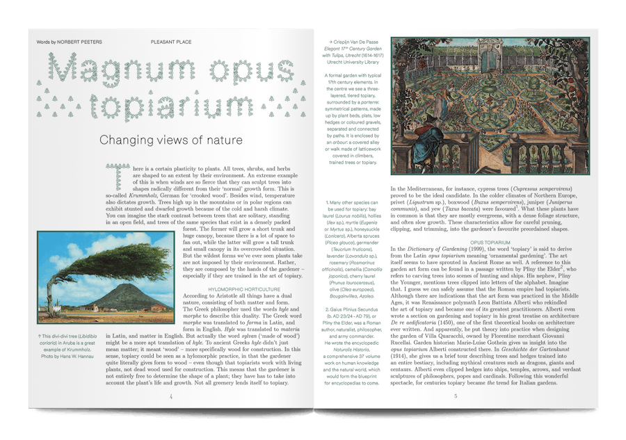A small and beautiful magazine from Amsterdam, Pleasant Place considers the art of gardening. This sixth issue is themed ‘Topiary’, and it digs into the history of cutting trees and hedges into strange shapes, as well as the most recent developments in this human compulsion, “To force the unruly natural world into submission, as if we were tiny gods on earth.”