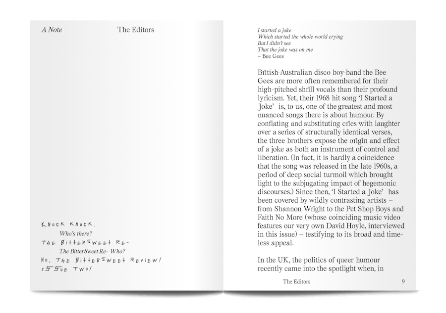 Describing itself as, “A literary magazine for queers and their friends”, The BitterSweet Review is a publishing platform dedicated to the advancement of queer literature and visual culture. This second issue is themed, ‘I started a joke’, exploring the places where queer culture and humour rub up against each other.